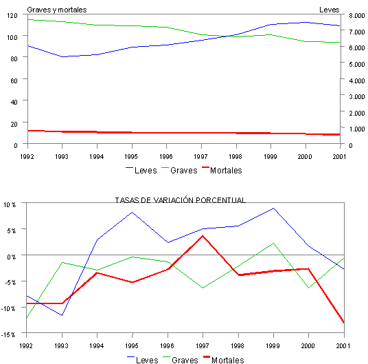 En cuanto al "índice de incidencia", en 2001 registró un descenso del 2,8 por ciento respecto al año anterior, debido a que el crecimiento experimentado por la población expuesta al riesgo, un 4,3 por ciento, fue mayor que el registrado en el número de accidentes. Según gravedad, la incidencia de los accidentes leves disminuyó en igual proporción, el 2,8 por ciento, la correspondiente a los accidentes graves descendió en un 0,5 por ciento y la incidencia de mortales registró un fuerte descenso, el 13,1 por ciento. La evolución de los índices de incidencia según la gravedad de los accidentes se puede observar en el gráfico III.