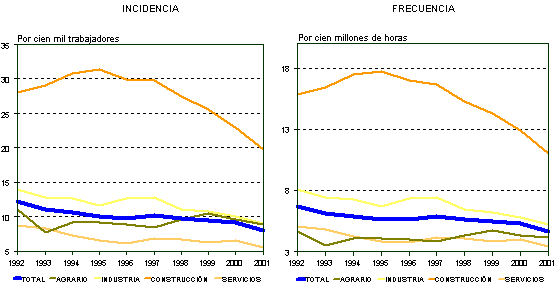 Por sectores de actividad, los índices de incidencia y frecuencia de los accidentes mortales en la Industria y los Servicios presentan evoluciones similares a las observadas en los índices generales; en cuanto a la Construcción, ambos índices registran un máximo en 1995, año a partir del cual comienza una tendencia descendente, con descensos importantes en los tres últimos años, que se mantiene en 2001; el sector Agrario, presenta un máximo en 1991 con un fuerte descenso en los dos años siguientes y un aumento muy acentuado en 1994, año a partir del cual se inicia un paulatino descenso que se interrumpe en 1998 y 1999, para iniciar un nuevo descenso en el año 2000, tendencia que se mantiene en 2001.