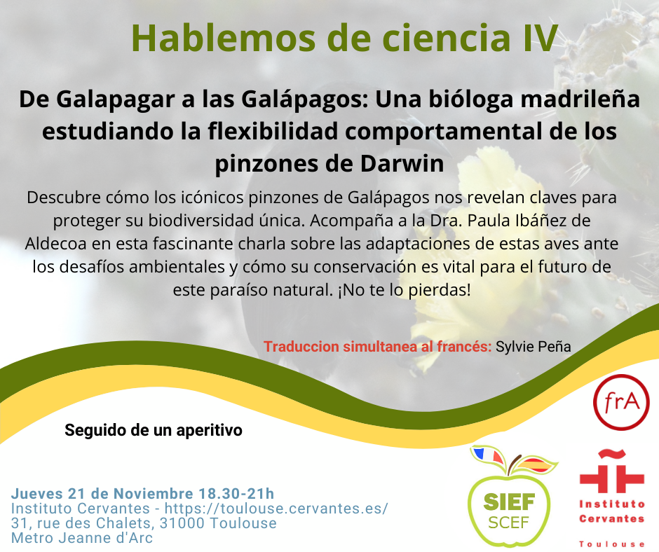 Dentro del Hablemos de Ciencia IV de Toulouse, se hablará sobre "De Galapagar a las Galápagos: Una bióloga madrileña estudiando la flexibilidad comportamental de los pinzones de Darwin".
